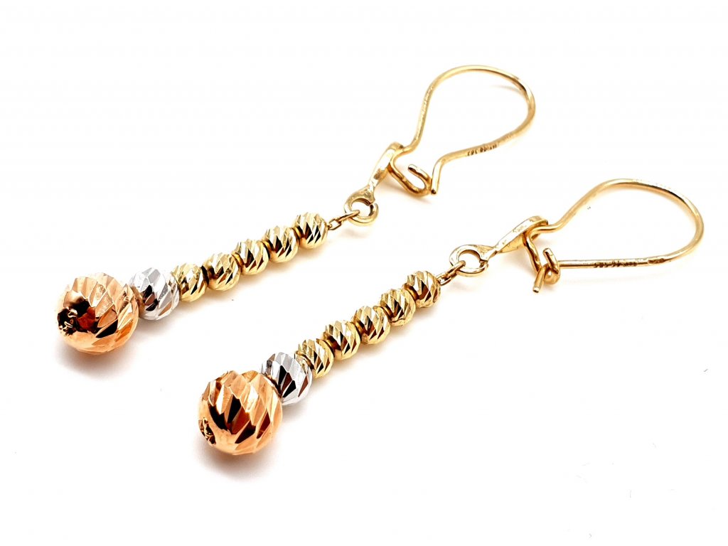 Visací náušnice v provedení tri-color vyrobené z bílého, žlutého a růžového zlata. Ryzost Au 585/1000.