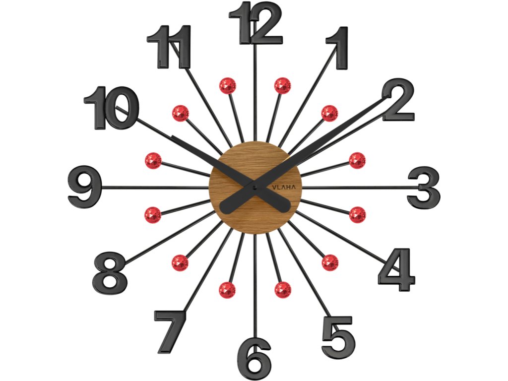 VLAHA Dřevěné černé hodiny s červenými kameny DESIGN vyrobené v Čechách ⌀49cm
