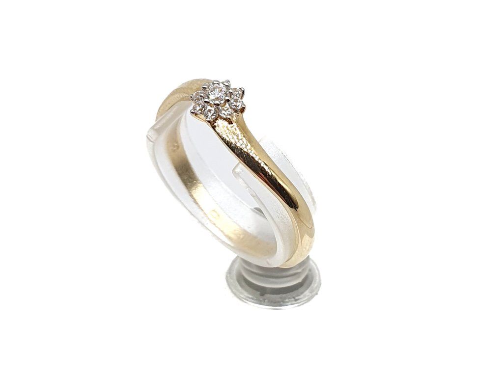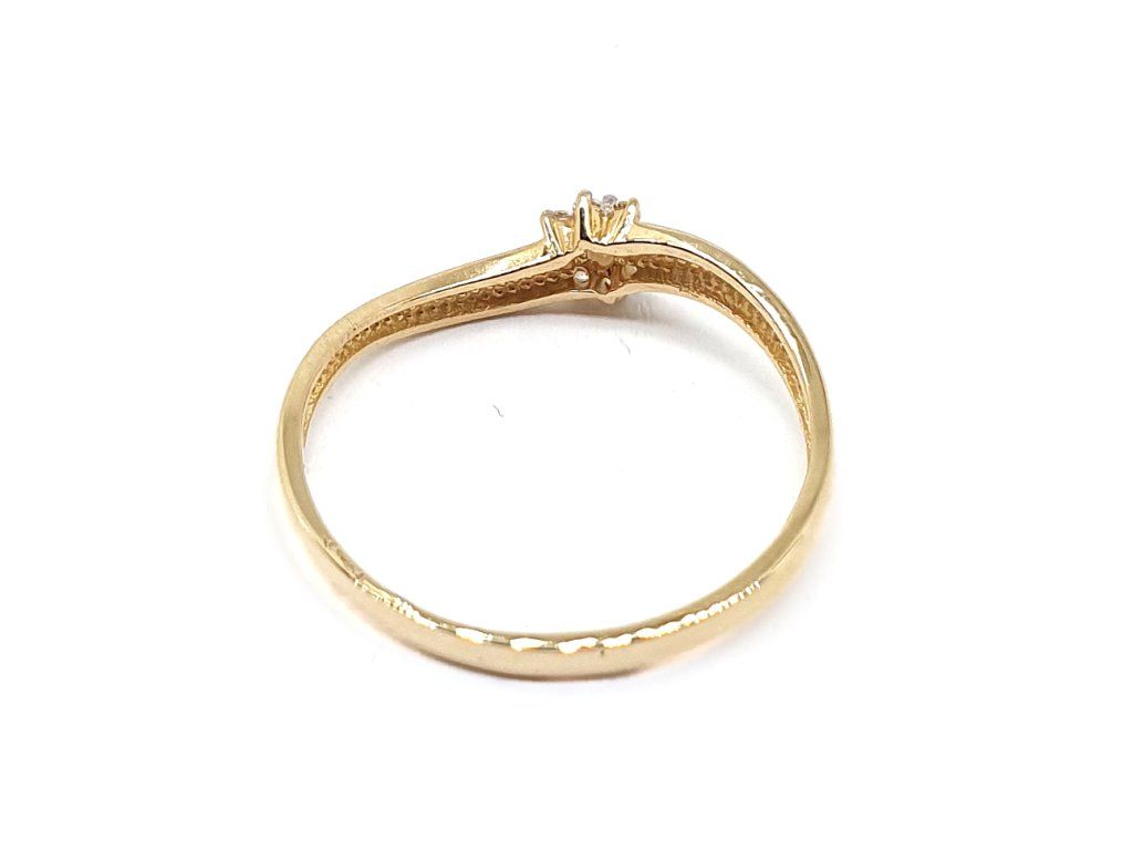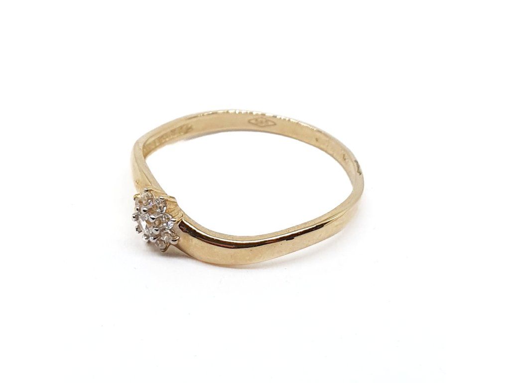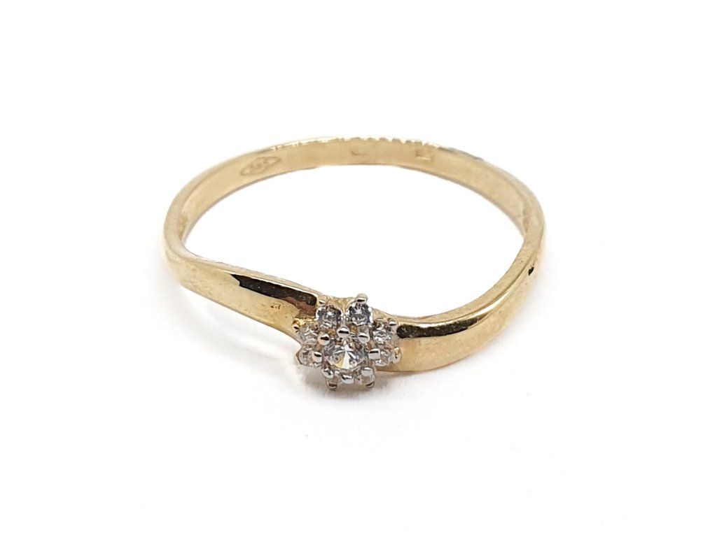 Něžný dámský prsten ze 14kt žlutého zlata zdobený centrálním motivem drobné květiny. Čiré zirkony usazené do tvaru květu v kombinaci s vlnitou šínou vytvářejí romantický a velmi ženský šperk.
