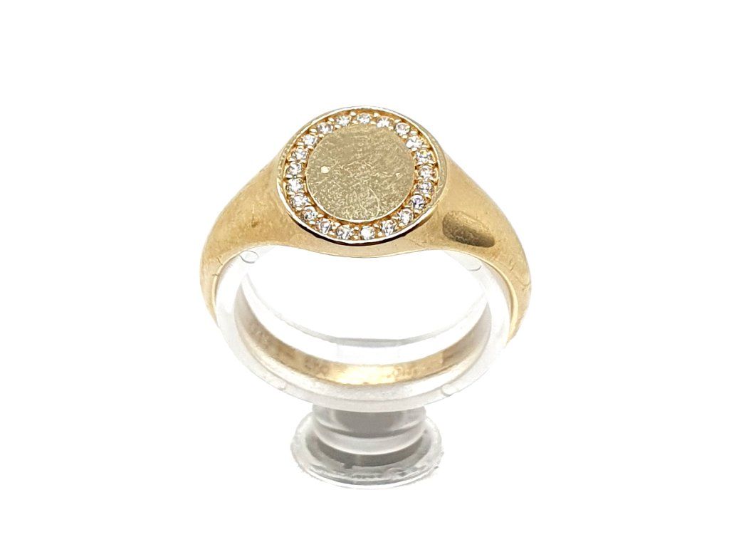 Elegantní dámský prsten ze 14kt žlutého zlata inspirovaný moderním stylem pečetních prstenů. Dominantní oválný střed s matným nádechem lemuje věnec zářivých čirých zirkonů, což vytváří luxusní a velmi vkusný doplněk.