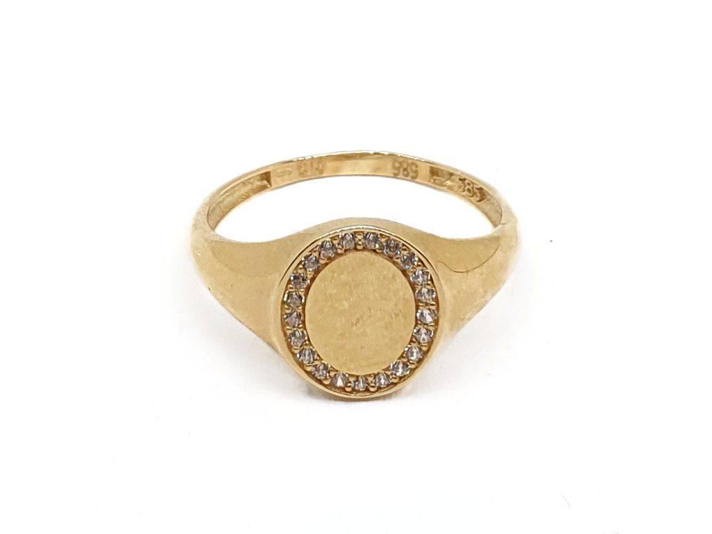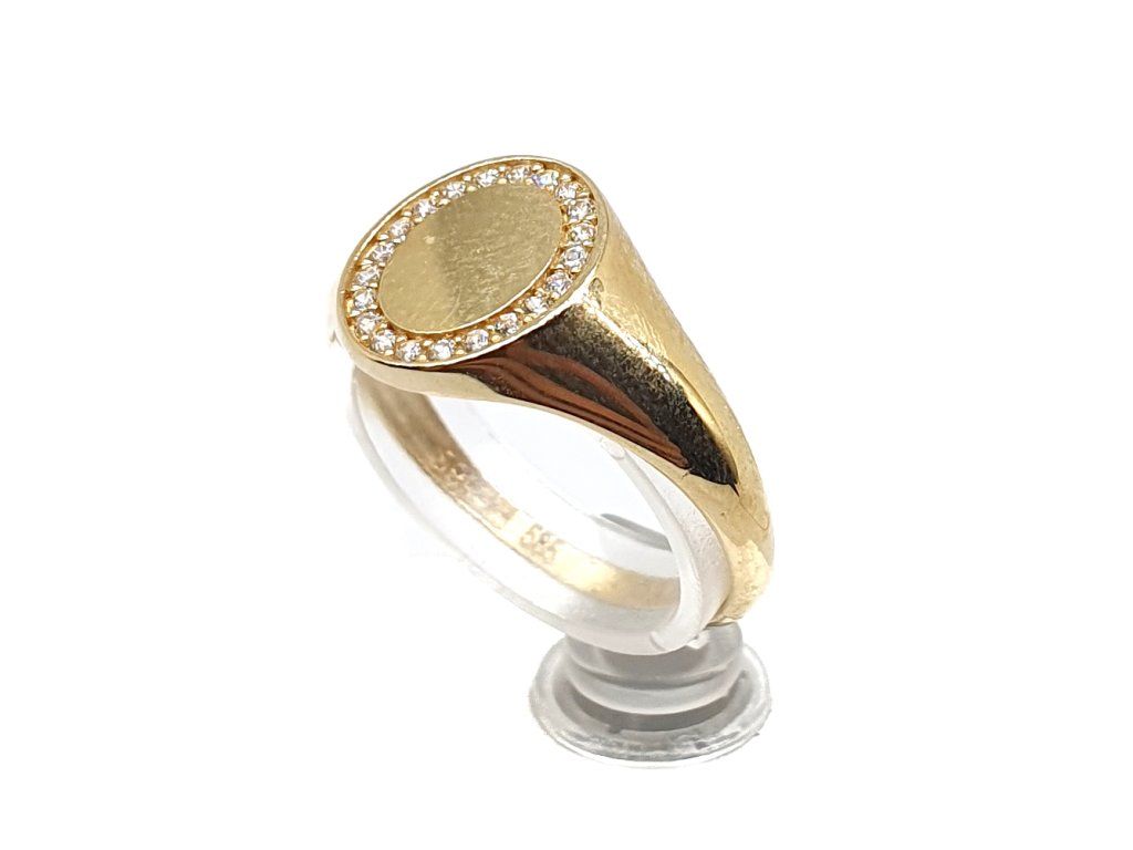 Zlatý 14kt prsten s oválným středem a zirkonovým lemem