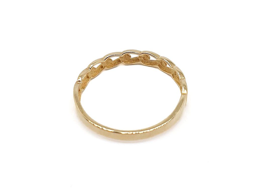Tento prsten vyrobený ze žlutého 14kt zlata sází na krásu propletených linií a čistotu kovu. Horní část šperku tvoří precizně zpracovaný vzor, který svým tvarem připomíná klasický pletený cop nebo řetízkovou vazbu. Díky prořezávanému (perforovanému) designu působí prsten na ruce velmi lehce a žensky.