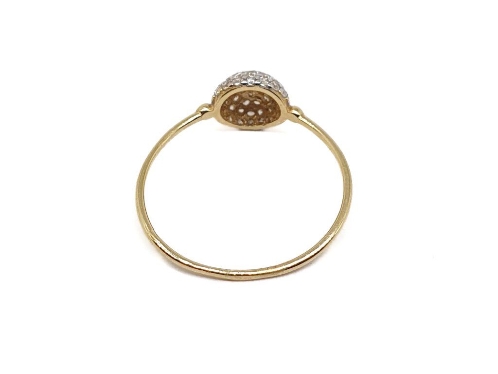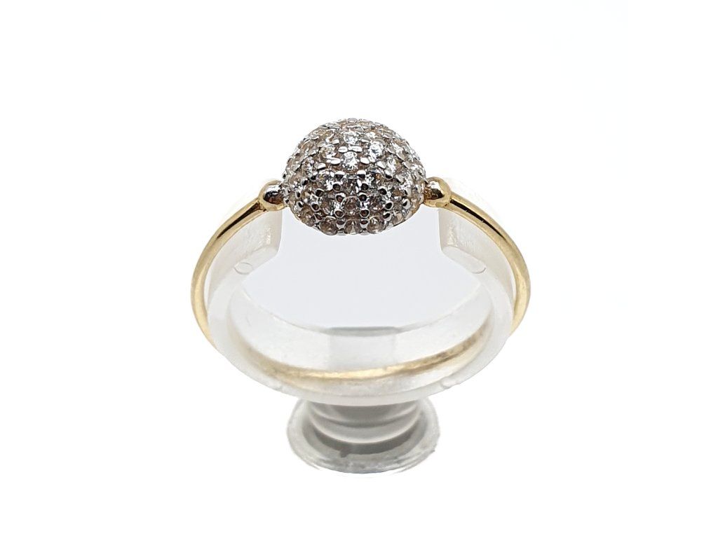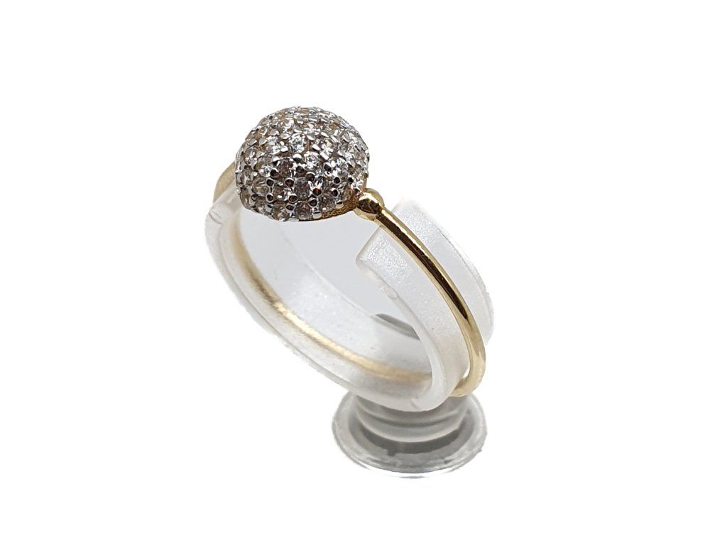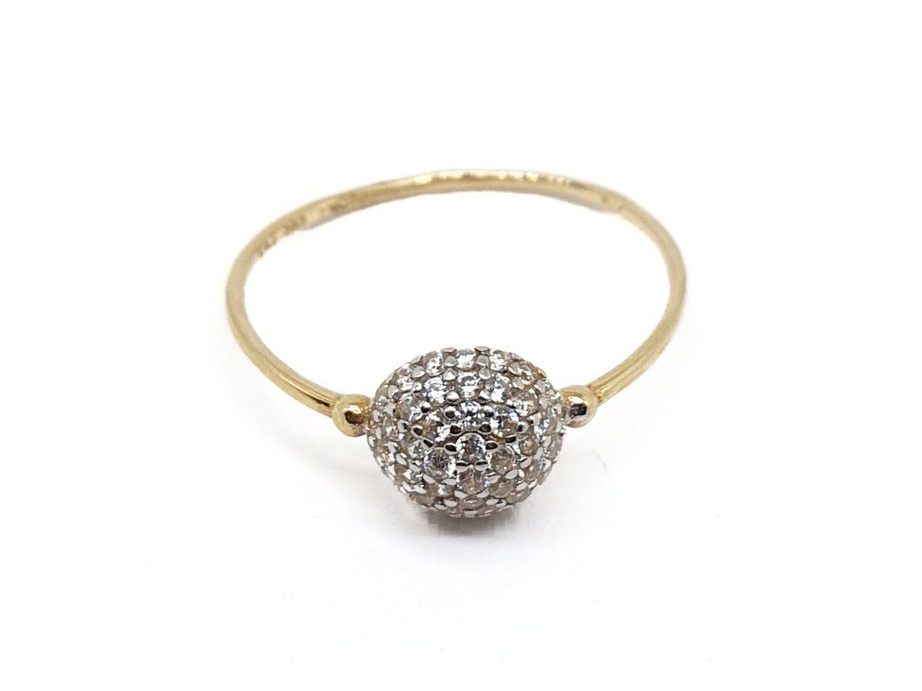 Decentní prsten ze 14kt žlutého zlata s dominantním prvkem ve tvaru kuličky osázené čirými zirkony. Minimalistický design v kombinaci s vysokým leskem vytváří elegantní šperk vhodný pro každodenní nošení i vrstvení.
