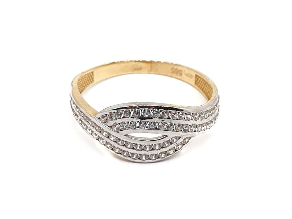 Elegantní prsten ze 14kt žlutého zlata ve velikosti 56. Design tvořený dvěma propletenými liniemi je hustě osázen čirými zirkony na bílém podkladu, což vytváří oslnivý lesk. Kvalitní šperk o váze 1,75 g.