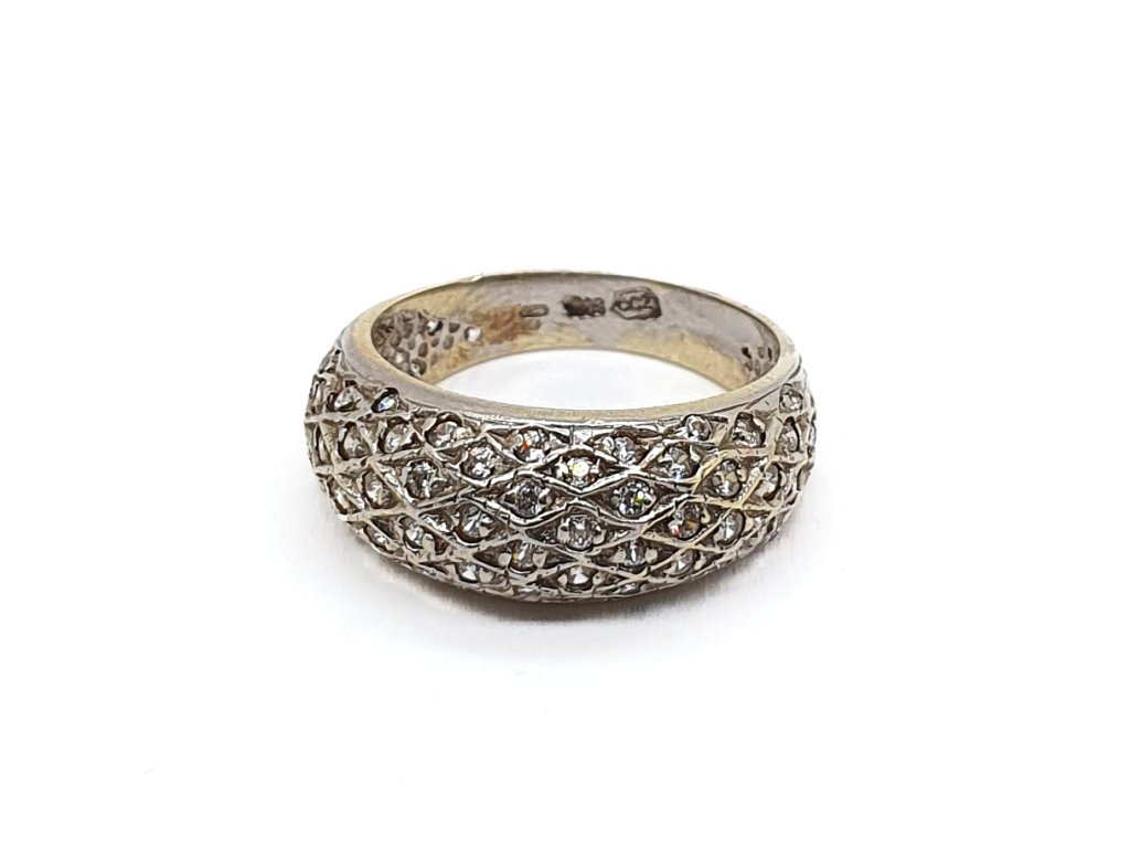 Masivní prsten ze 14kt žlutého zlata s výrazným prolamovaným vzorem připomínajícím jemné pletivo. Design je oživen linií z bílého zlata, která šperku dodává moderní kontrast a šmrnc. Navzdory své šířce působí díky mřížkování lehce a vzdušně.