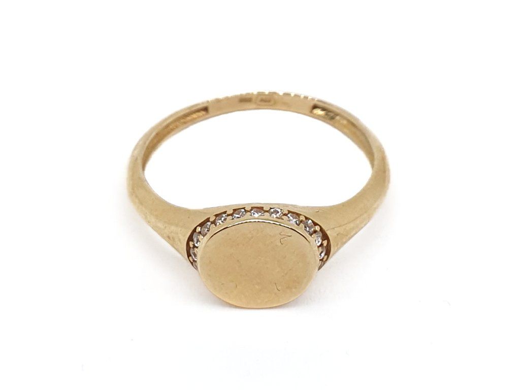 Zlatý prsten s kulatou plotýnkou a zirkonovým lemem