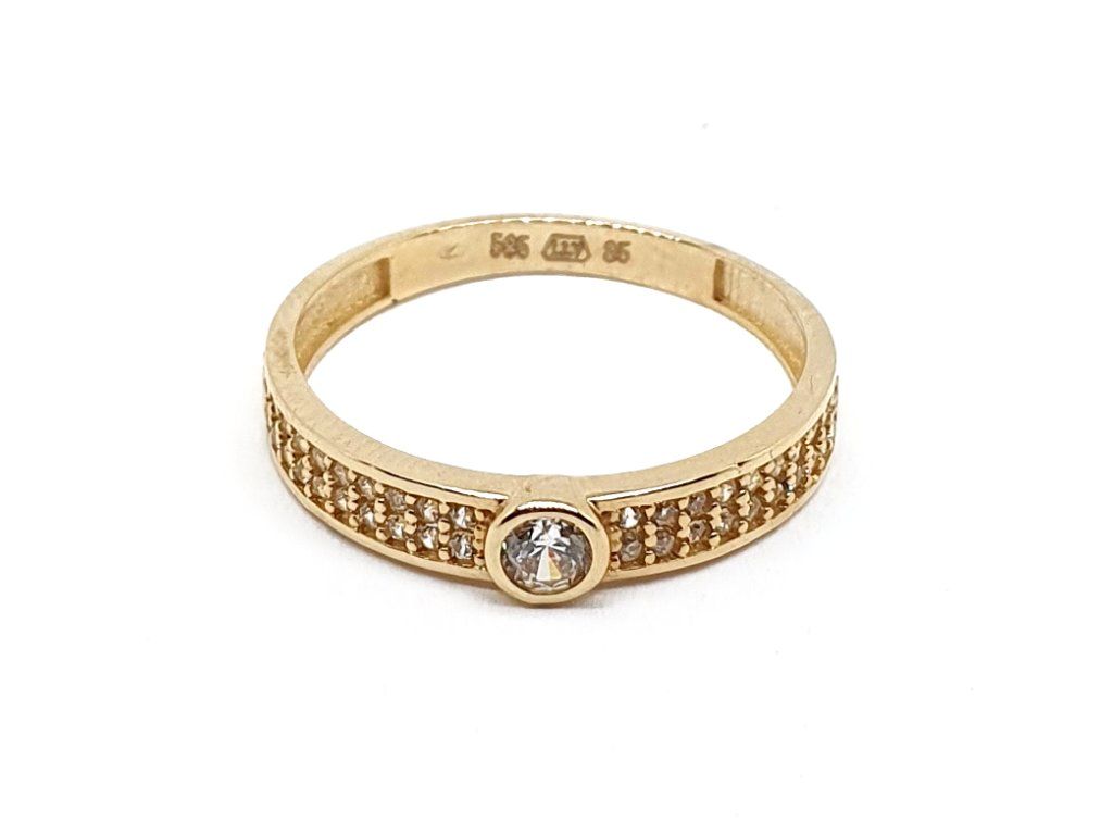 Luxusní a vysoce praktický prsten ze 14kt žlutého zlata ve velikosti 54. Centrální zirkon je bezpečně zapuštěn v lunetě a doplněn dvěma řadami drobných zirkonů po celém obvodu ramen. Kvalitní šperk o váze 1,80 g.