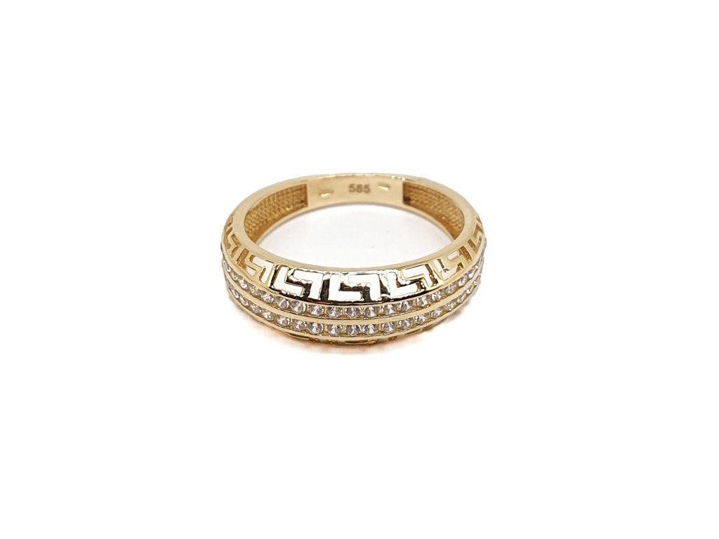 Luxusní prsten ze 14kt žlutého zlata o velikosti 53,5, který kombinuje nadčasový řecký vzor se dvěma řadami zářivých zirkonů. Elegantní šperk s váhou 1,90 g, který na ruce nikdo nepřehlédne.