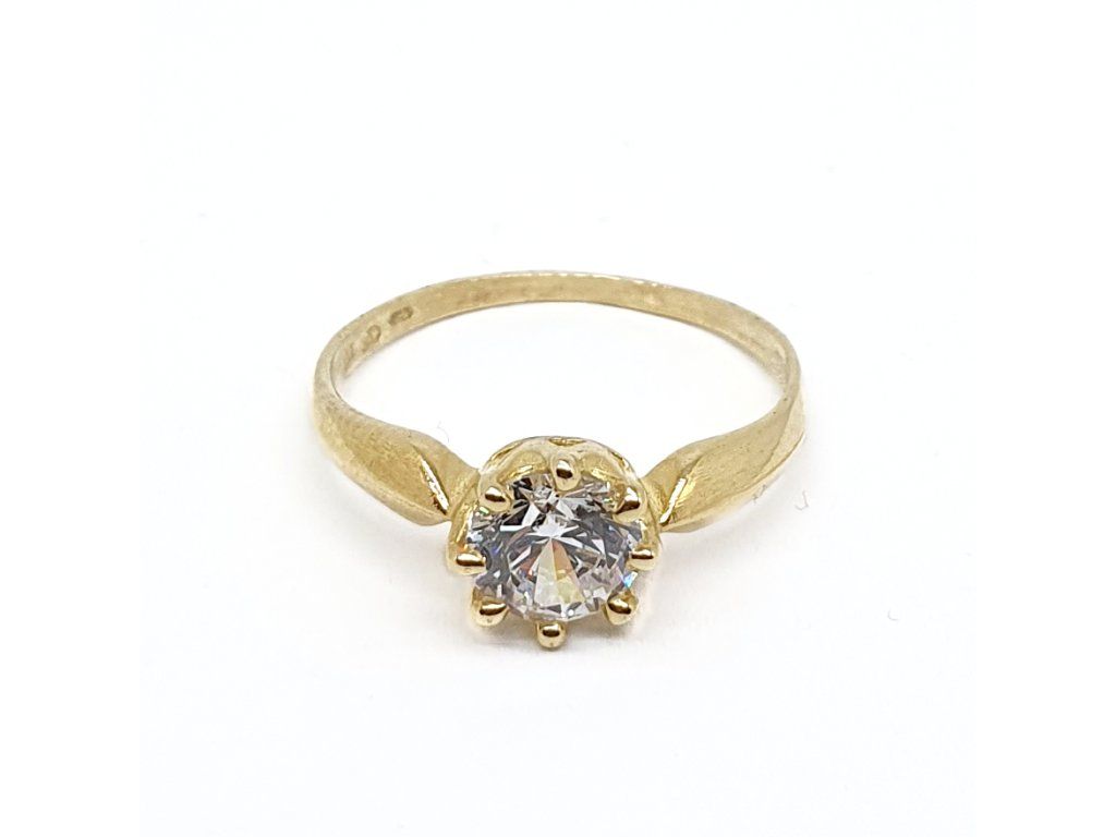 Zlatý zásnubní prsten s čirým zirkonem v ozdobné korunce