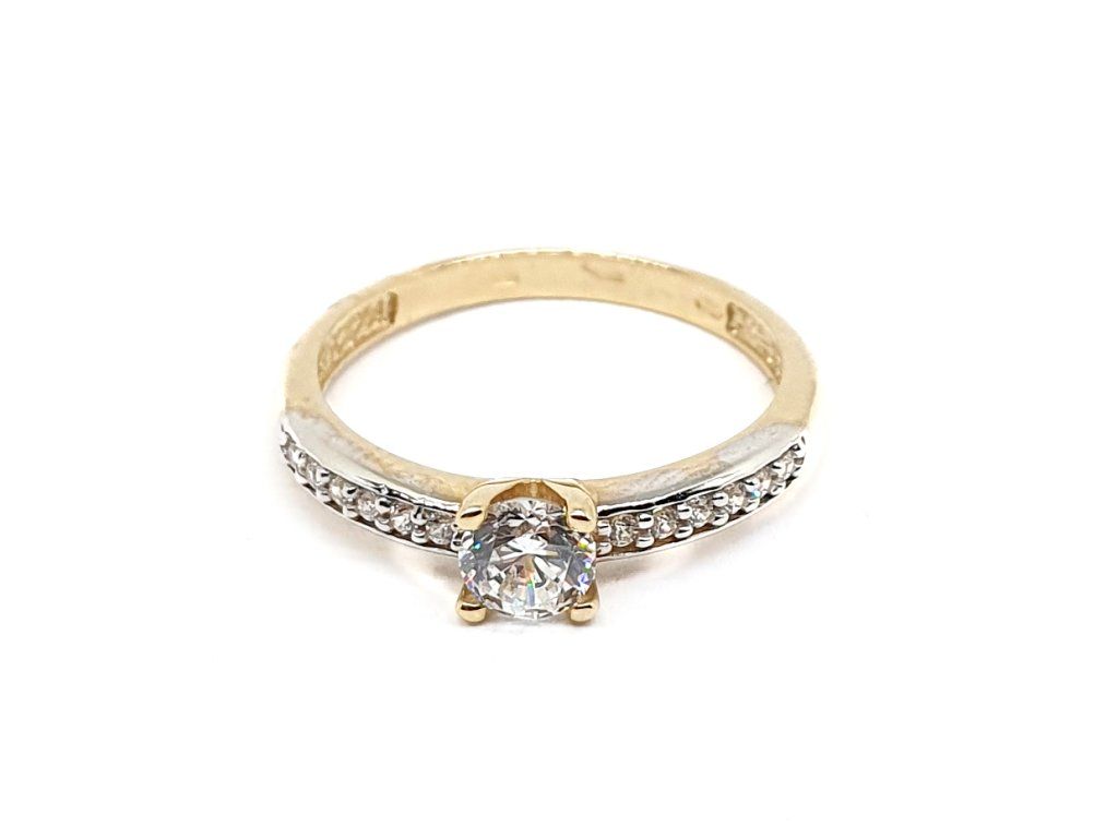 Exkluzivní zásnubní prsten ze 14kt žlutého zlata ve velikosti 50. Horní část ramen je zdobena řadami čirých zirkonů na bílém podkladu, což podtrhuje brilanci centrálního kamene. Elegantní šperk o váze 1,85 g.