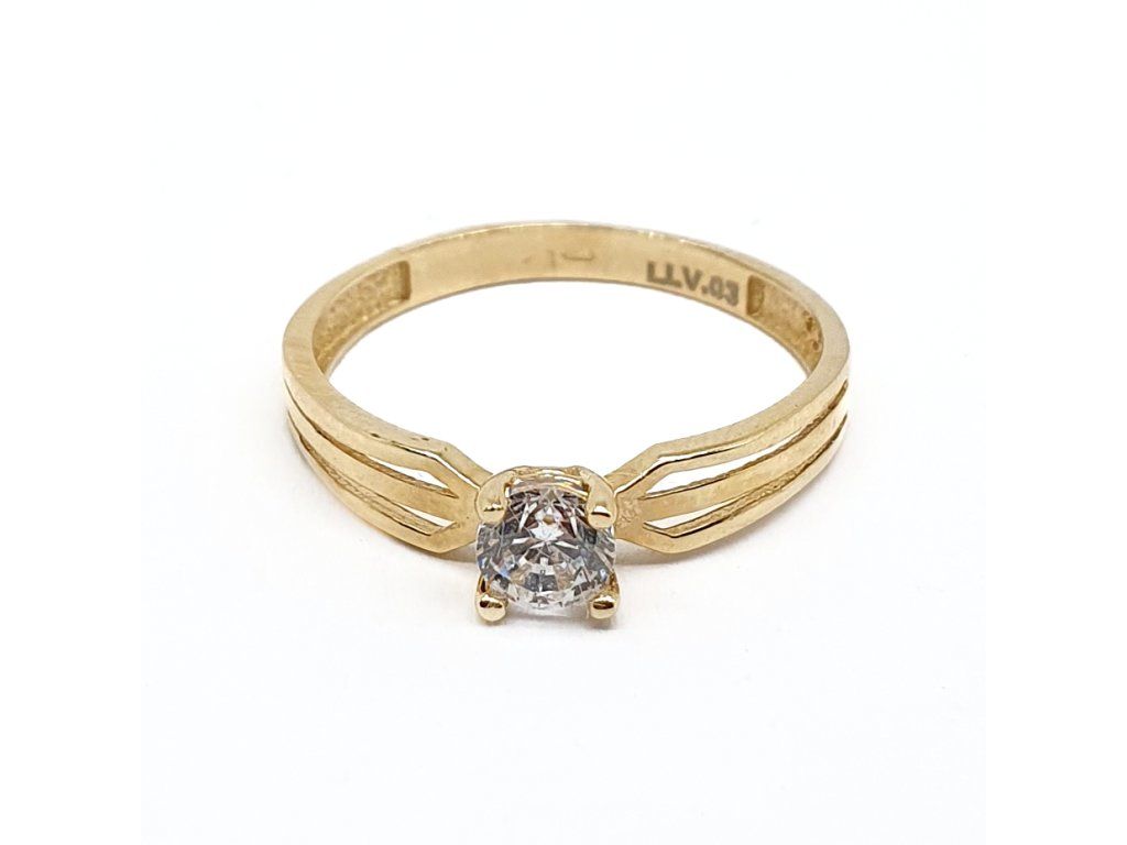 Elegantní zásnubní prsten ze 14kt žlutého zlata ve velikosti 54. Centrální čirý zirkon je zasazen do klasické korunky, kterou doplňují stylově rozdělená ramena obroučky. Vkusný šperk o váze 1,40 g.
