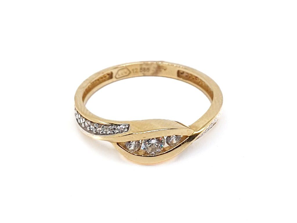 Zlatý zásnubní prsten s trojicí zirkonů vlnitého designu