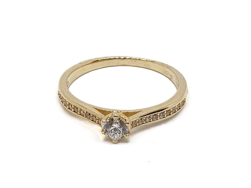 Exkluzivní zásnubní prsten ze 14kt žlutého zlata ve velikosti 52. Centrální čirý zirkon je doplněn dvěma řadami jemných zirkonů zasazených přímo do obroučky. Velmi elegantní šperk o váze 1,75 g pro žádost o ruku v královském stylu.