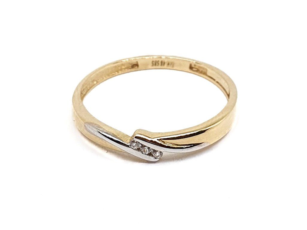 Jemný zásnubní prsten ze 14kt žlutého zlata o velikosti 54. Elegantní design s překříženými liniemi doplňují tři čiré zirkony zasazené do rhodiované části pro vyšší lesk. Velmi lehký šperk o váze 1,20 g.